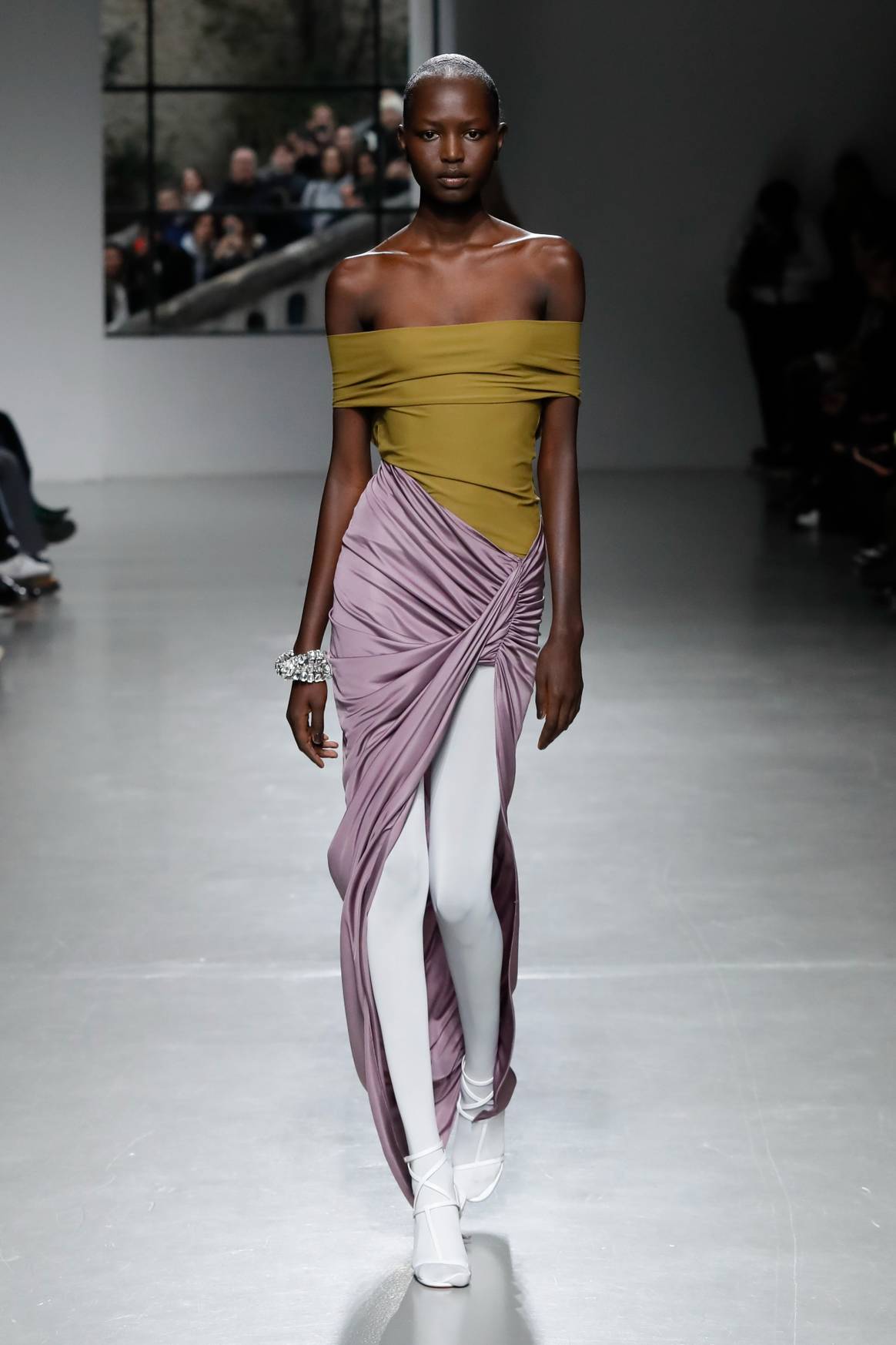 From Antonin Tron, an olive stretch jersey off-the shoulder top and a lilac satin floor-length draped skirt was shown with white hose and sandals.
